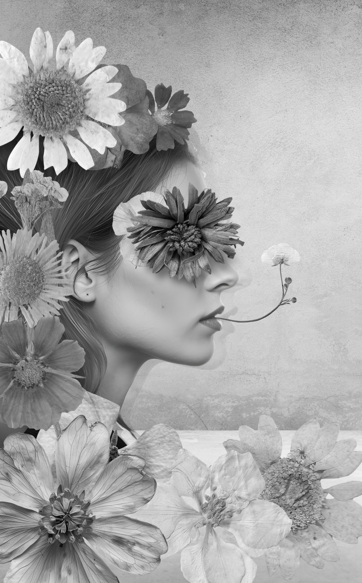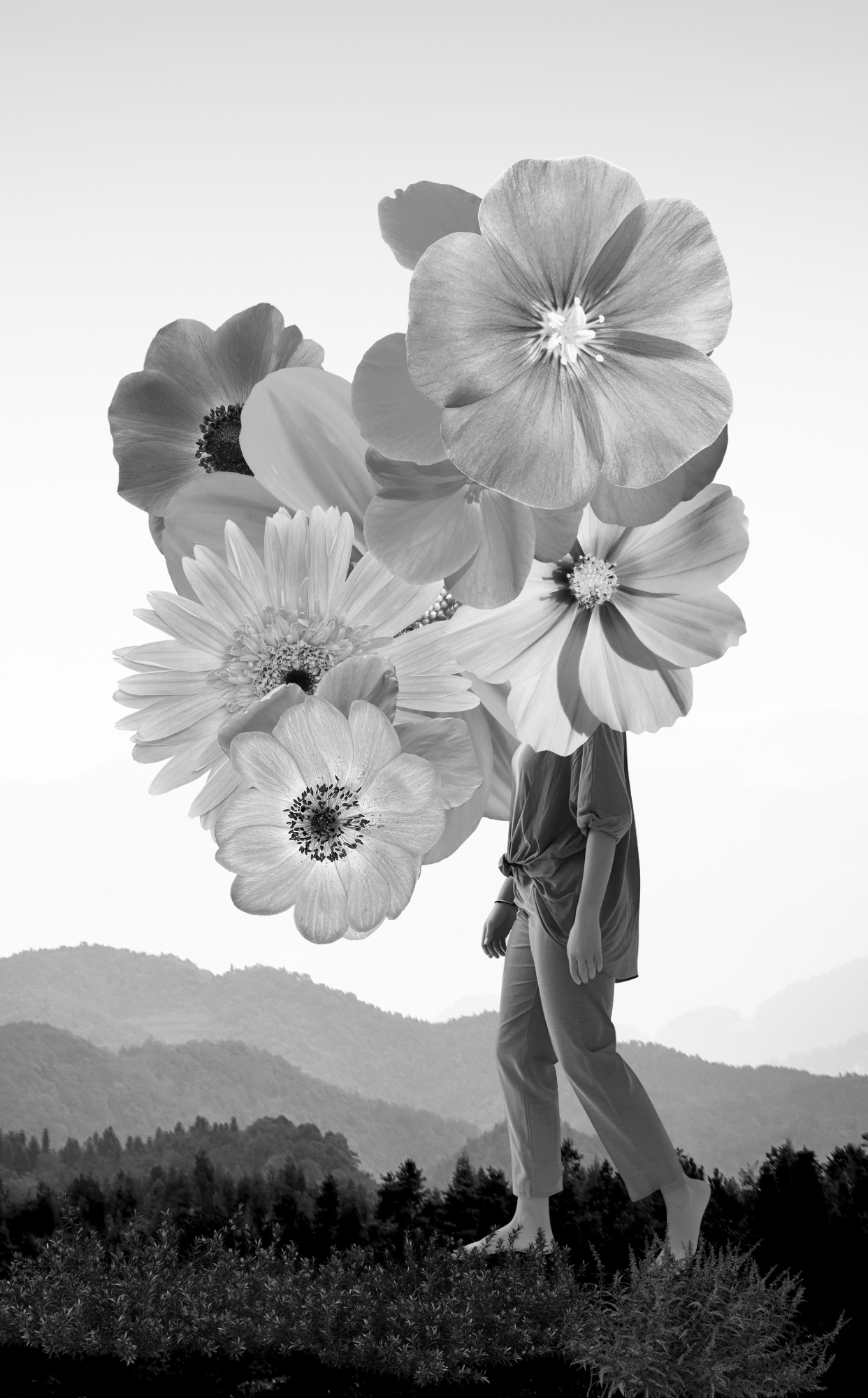 Minimalist poems meet grayscale collages, creating a dialogue between word and image.